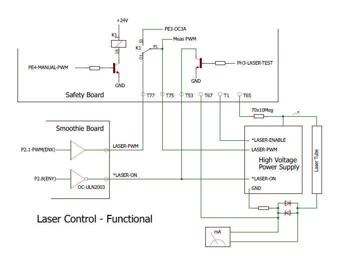 The laser power % is controlled by a PWM signal from the SMB to have the laser intensity modulated by the job. Alternatively the power % can be adjusted by hand on the console. For that the relay K1 is activated and a locally generated PWM signal is sent to the HVPSU. The indicator on the GUI always shows the actual PWM% which goes to the HVPSU.