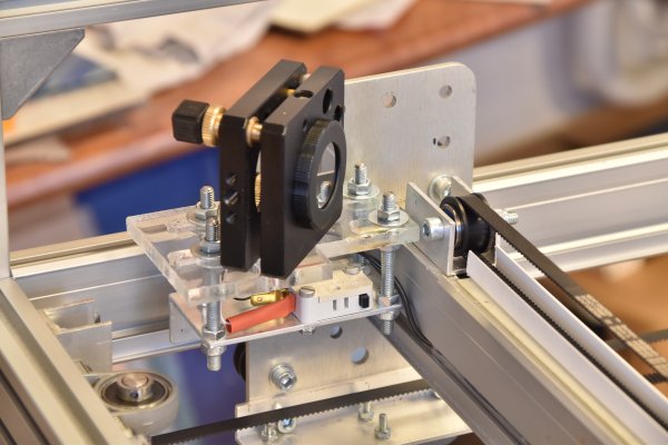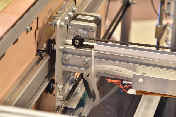 The X motor seen from the backside of the machine. We also see the Y-caterpillar carying the air-assist hoses and some electric cables.