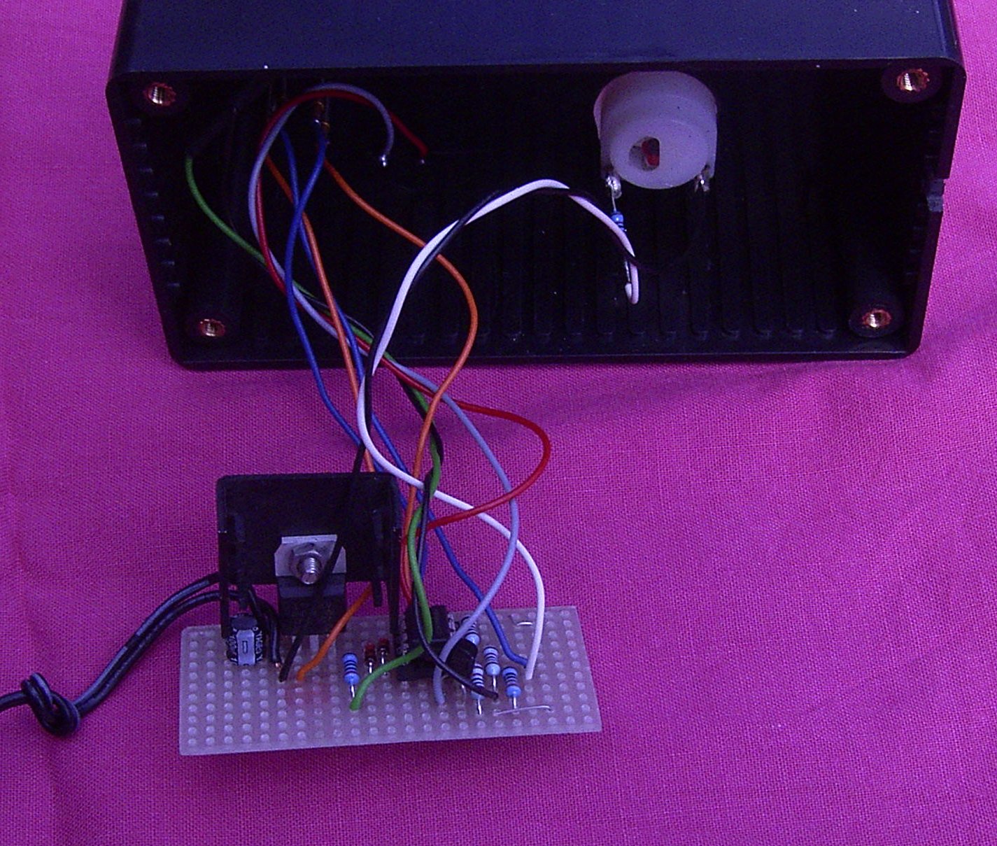 The whole unit, including DC power-plug supply. Note the VU meter, the LED indicating that power is on, the Gas-Sensor amd the buzzer.