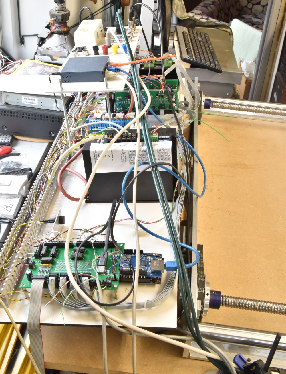 Het elektronica paneel ligt nu horizontaal, maar uiteindelijk komt het vertikaal te hangen in het achteronder van de kist waar de machine op komt te staan.