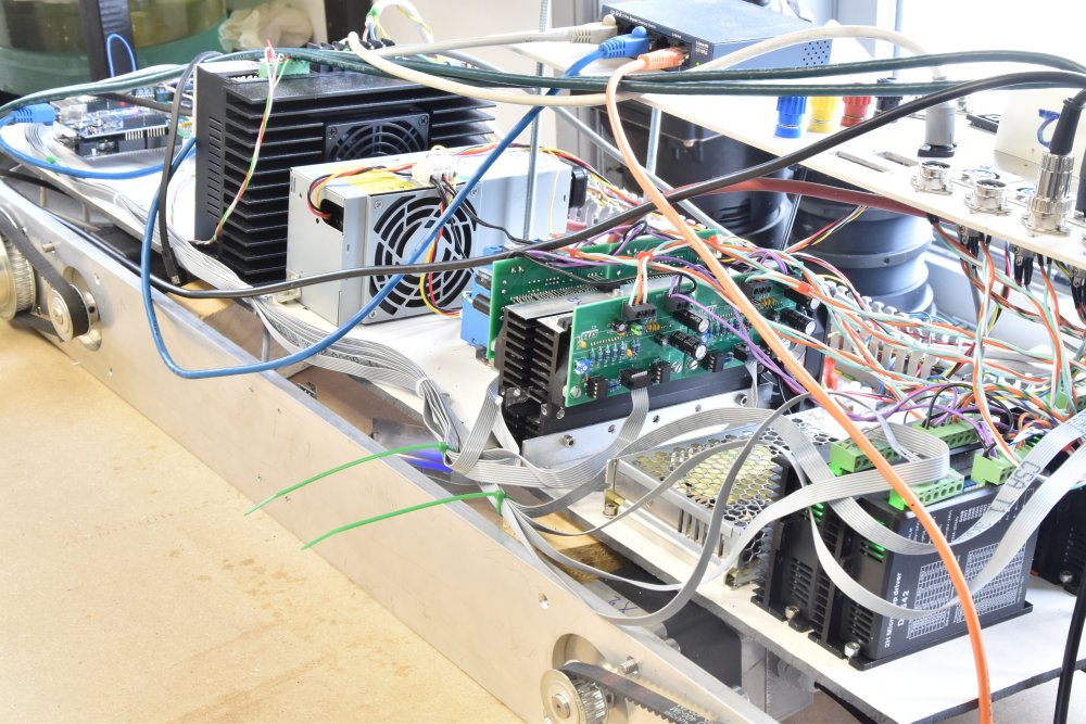 Niet zichtbaar hier: De beide X motoren hebben een codeerschijf waarmee gechecked wordt of ze wel gelijk-op draaien. Als dat niet zo is stopt de boel met een X-Alarm melding. Als 1 X-motor zou weigeren is de andere in staat om de brug flink te verwringen.
