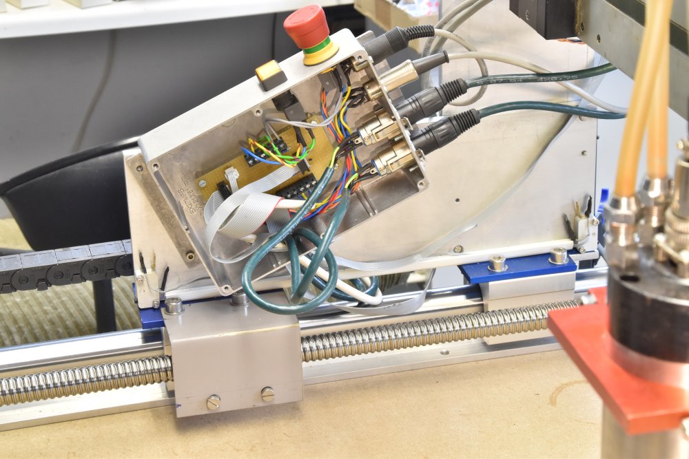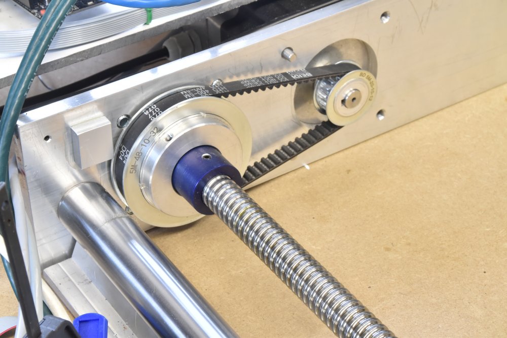 Detail X-aandrijving. De schroefspindels hebben een spoed van 5 mm en driven de brug aan met kogelomloopmoeren.