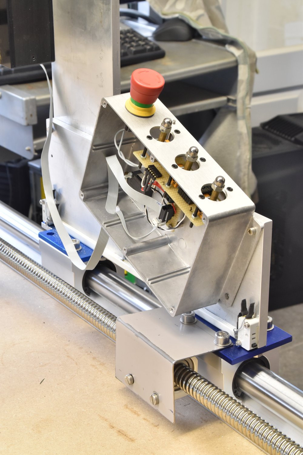 Detail van de Z-aandrijving. We zien de kogelomloop blokken met de geleide stangen.