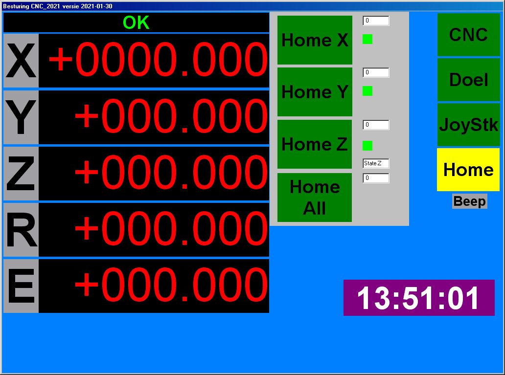 We zien de actuele posities van de assen. X, Y, Z is zelfverklarend, R is een optionele verdeel tafel (zie boven). E is een losse motor die voor van alles gebruikt kan worden. De R- en de E-motoren kunnen zowel van het twee- als het driefasen type zijn.