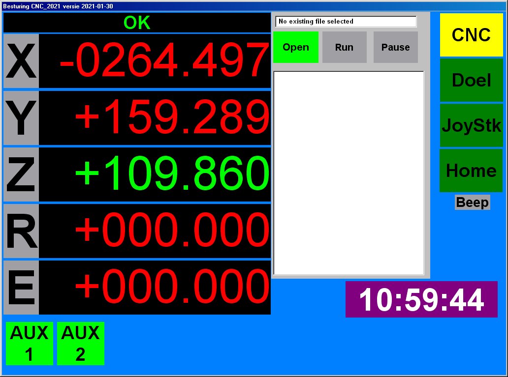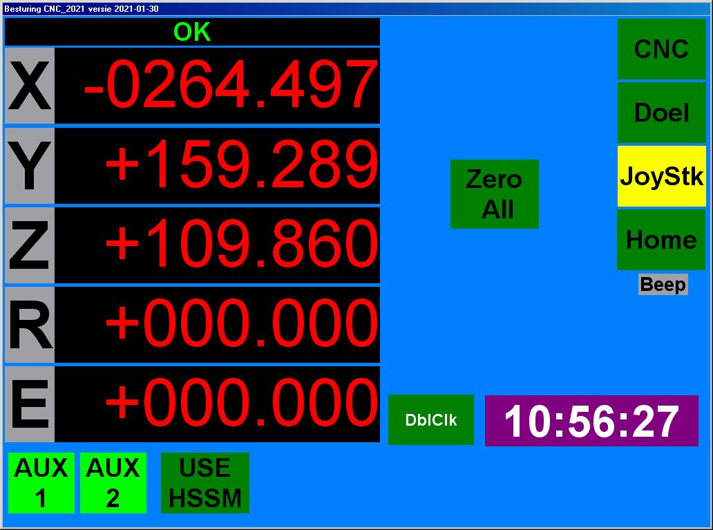 Bediening: Via het touch-screen handmatig (1 as tegelijk), met Joysticks (voor nulpunt instellen) of met een G-code bestand voor het echte werk.