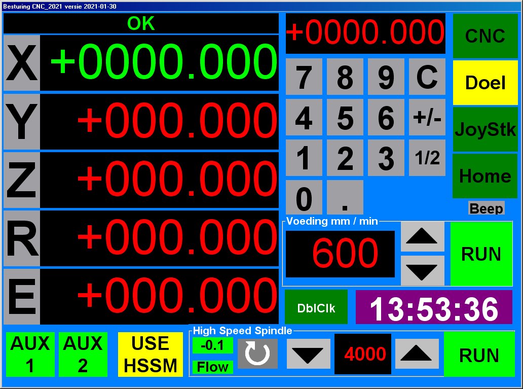 Er is een cijferveld waarmee een doelpositie opgegeven kan worden, de voedingssnelheid kan ingesteld worden en onderaan zien we de snelheidsinstelling voor de freesmotor. Aux 1 en 2 zijn geschakelde 24 VDC of 230 VAC uitgangen voor 1 of ander ding, bijv een stofzuiger.