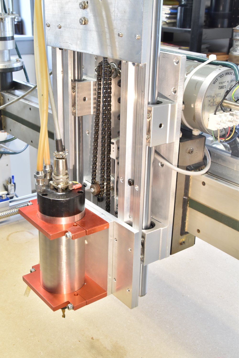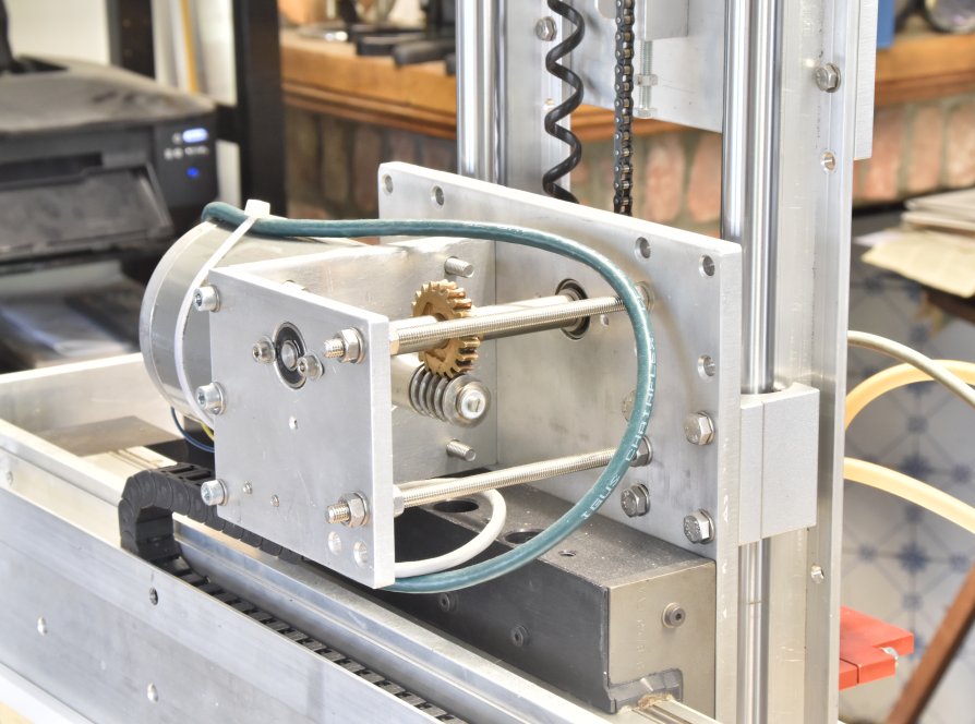 Detail Z-aandrijving. We zien de stappenmotor die via een worm de as van het bovenste kettingwiel aandrijft
